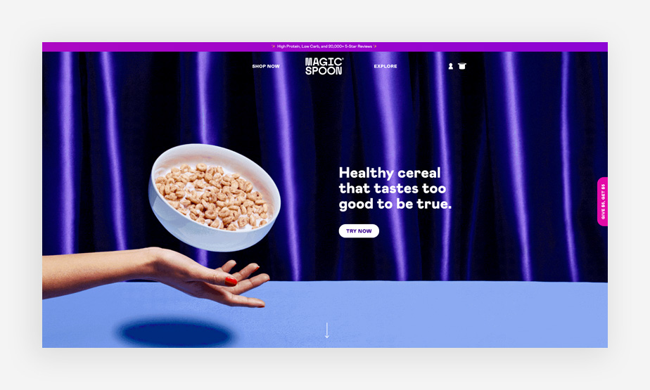 Magic spoon. Эти хлопья — питательная взрослая версия главного блюда детства. Визуальная айдентика бренда олицетворяет это заявление, сочетая яркие детские оттенки с ретро-серым, что каким-то образом выглядит современно. Каждый элемент бренда, от логотипа до оформления фотографий в Инстаграм подпитывает историю и цель бренда в формате развлечений.