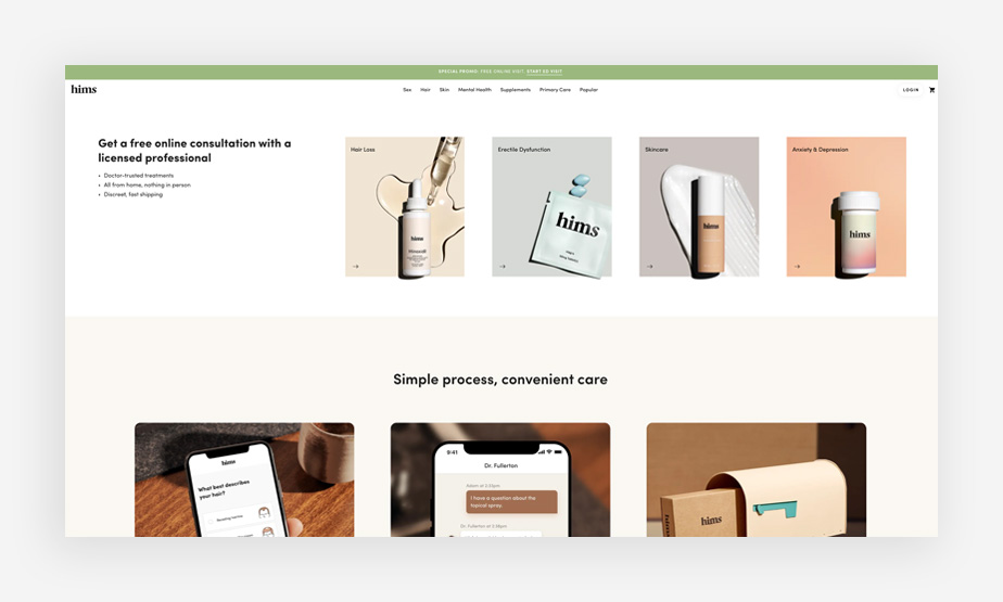 Hims. Бренд для здоровья и благополучия мужчин основан в 2017 году. Удобный сервис для персонализированного лечения, который пролил свет на проблемы, считающимися раньше табуированными.
