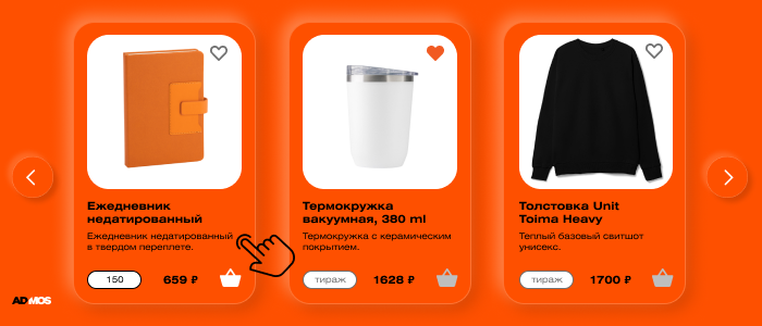 Мы тоже запустили внутренний вебшоп ADMOS. В нем можно приобрести крутой мерч за ADMOS-рубли, которые сотрудники получают за идеи, отзывы, победы в соревнованиях по отделам и даже просто в подарок от коллег.