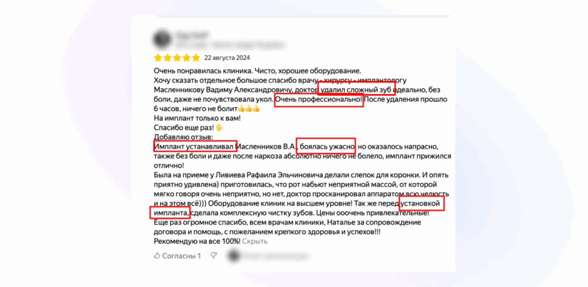 Алгоритм выхватывает именно эти детали, потому что они совпадают с тем, что люди чаще всего ищут в Яндексе. Чем больше отзыв «цепляется» за реальные ключевые моменты, тем сильнее он влияет на ваш рейтинг.