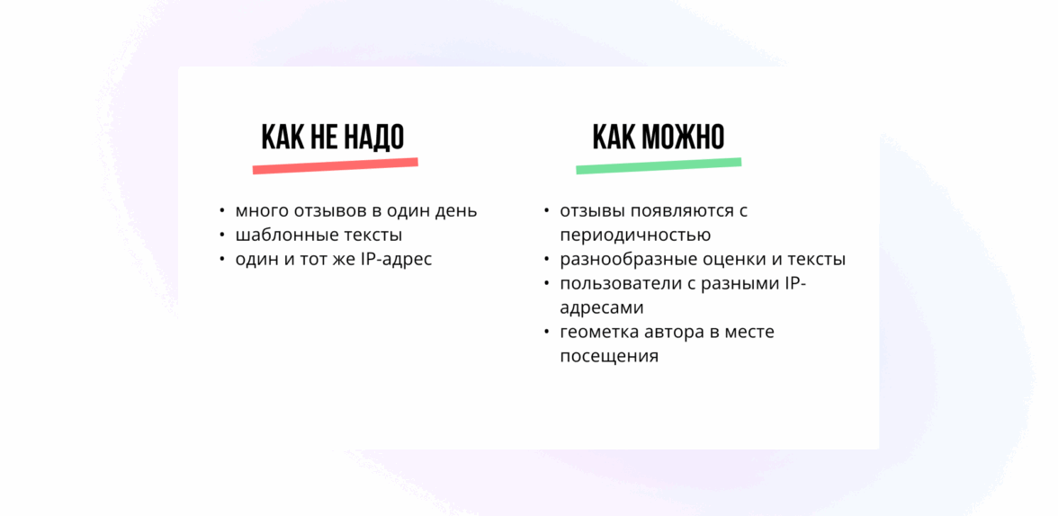 Если отзыв о вашей компании появляется именно в это время, алгоритм считает его «естественным» и он будет иметь больший вес. А вот если тот же человек внезапно оставит комментарий в три часа ночи — он может дольше задержаться на модерации.