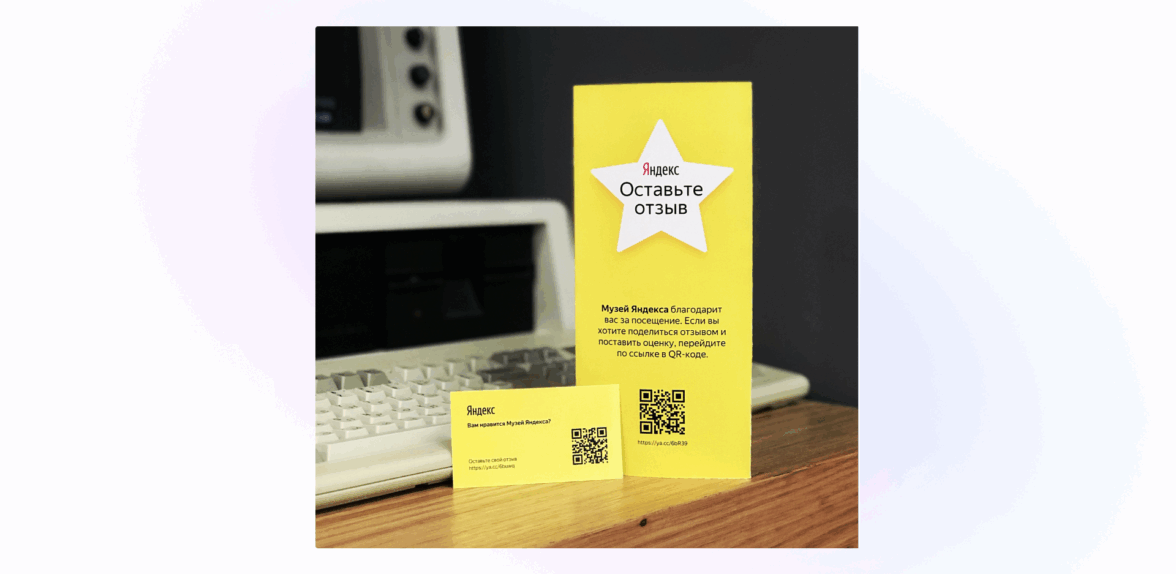 Расставьте таблички с QR-кодами на ресепшн, по которым легко перейти на вашу карточку компании и оставить положительный отзыв.