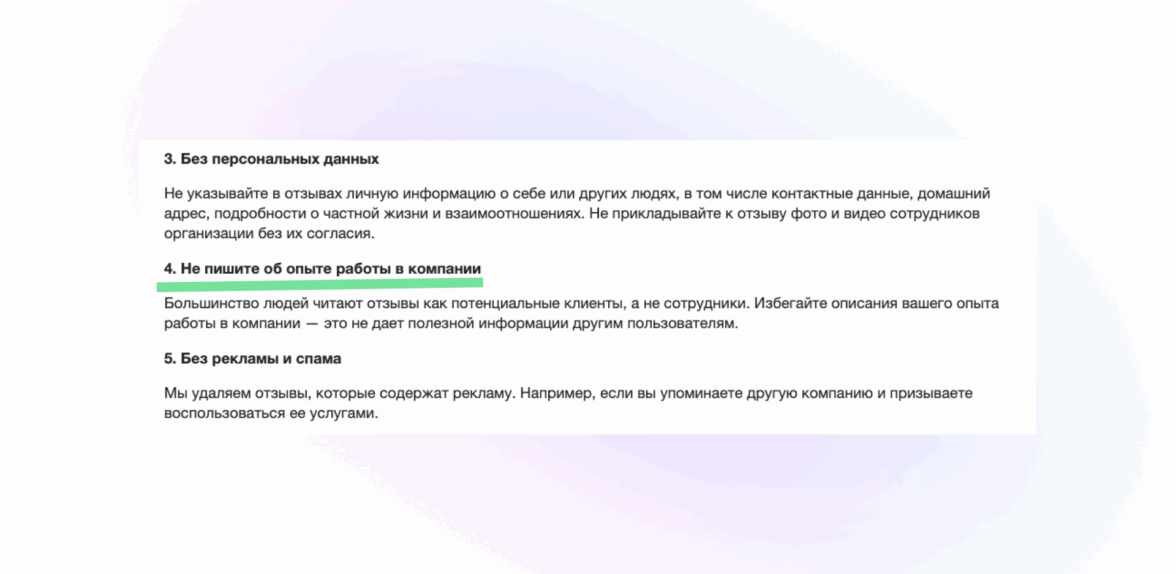 Еще один момент, о котором часто забывают: Яндекс.Карты убирают отзывы, если в них пишут не о компании как о сервисе, а о работодателе. Это отдельное правило, и им стоит пользоваться.