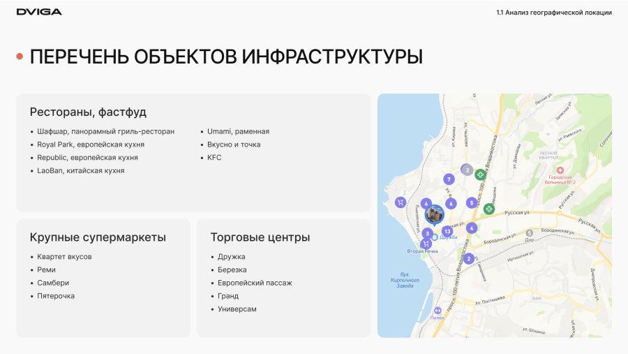 Чтобы наглядно показать удачное расположение ЖК и доступность инфраструктуры, мы создали карту социальных и коммерческих объектов и серию слайдеров с важными локациями и временем пути до них.