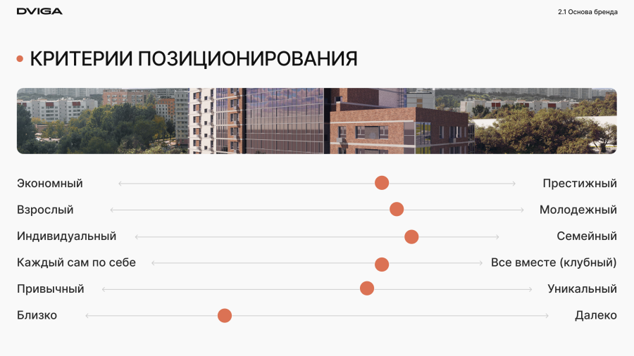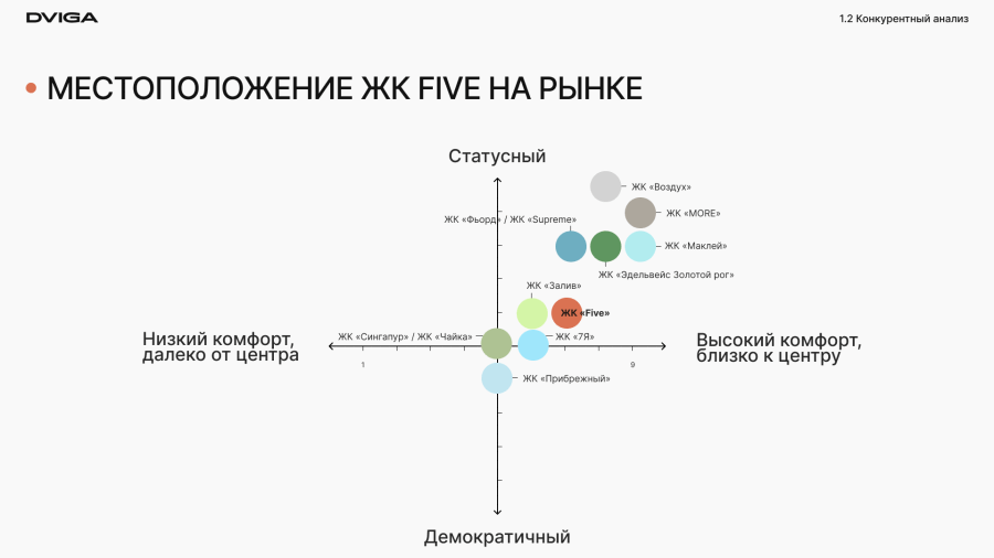 В список конкурентов добавили все строящиеся ЖК комфорт-класса в районе и все ЖК бизнес-класса в городе. Это нужно, чтобы понять сильные и слабые стороны заказчика и предложить наиболее выгодное позиционирование, которое поможет отстроиться от конкурентов.