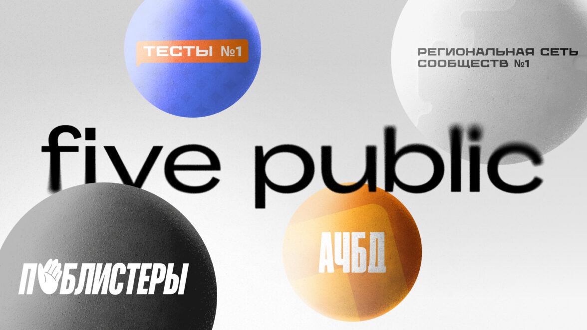 Five public провел большую реконструкцию бизнеса, пересмотрел свою структуру и визуализацию. Теперь это четыре самостоятельных продукта: региональная сеть городских сообществ №1, Паблистеры, развлекательный спецформат «Тесты №1» для регионов, медиа о настоящем и будущем России АЧБД.