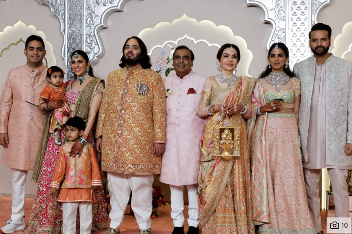 Самый богатый человек Азии Мукеш Амбани (на фото в центре) в 2024 году потратил на свадьбу сына Ананта (в костюме с изображением слона) примерно $600 млн — $1 млрд
