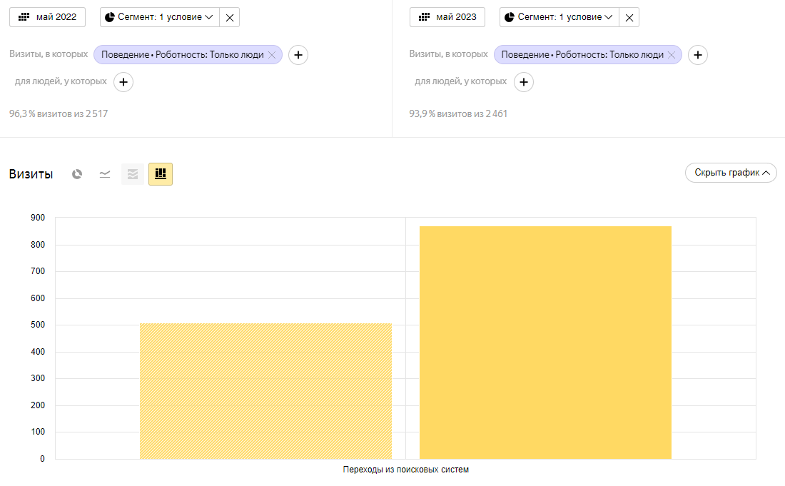 По итогам 6-го месяца продвижения объем трафика из поисковых систем за май 2023 увеличился на 70% относительно мая 2022.