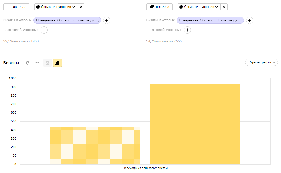 По итогам 9-го месяца продвижения объем трафика из поисковых систем за август 2023 увеличился на 114% относительно августа 2022.