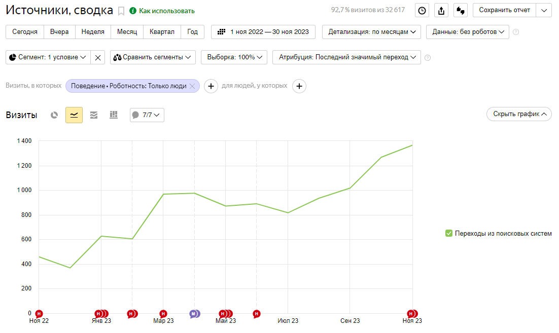 По итогам 1 года продвижения объем трафика из поисковых систем за ноябрь 2023 увеличился на 198% относительно ноября 2022, то есть в 3 раза.