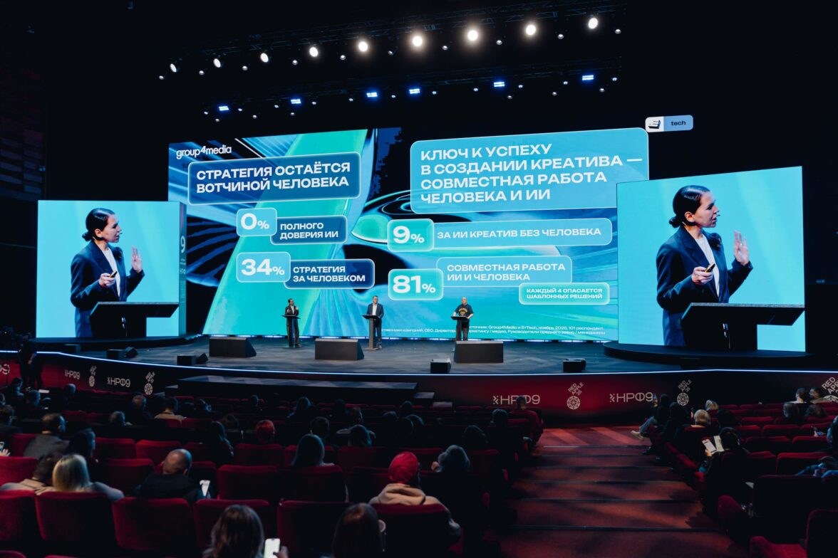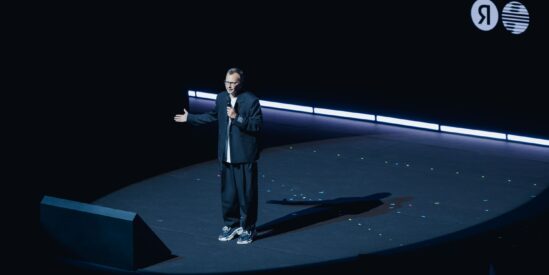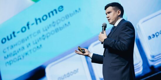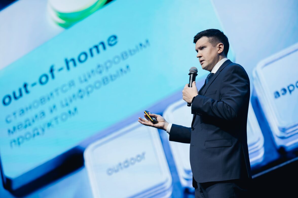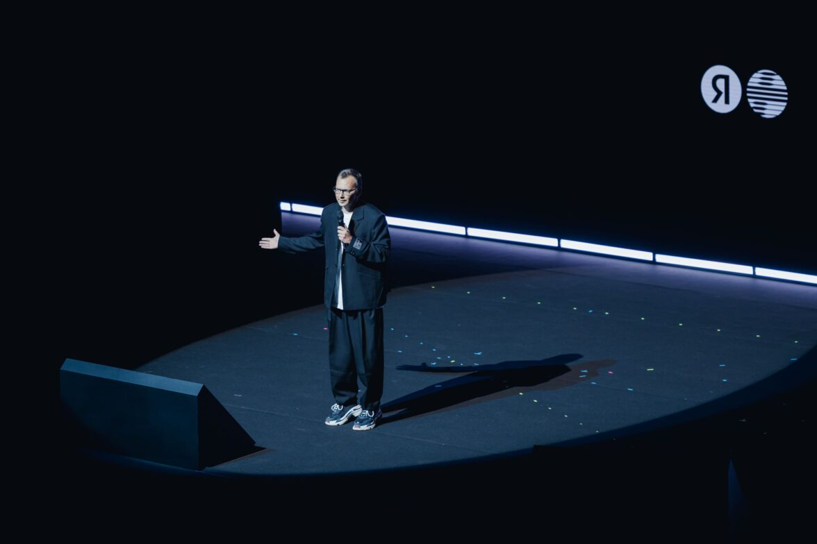 Перфоманс от Яндекс Плюс AdTech, на сцену выходит руководитель Яндекс Плюс Adtech Андрей Гевак, с гордостью представляя индустрии нового игрока.