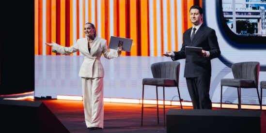 «Медиа без границ». Импровизированное «Утро ТНТ», на сцене — актриса Анна Хилькевич и блогер Давид Манукян.