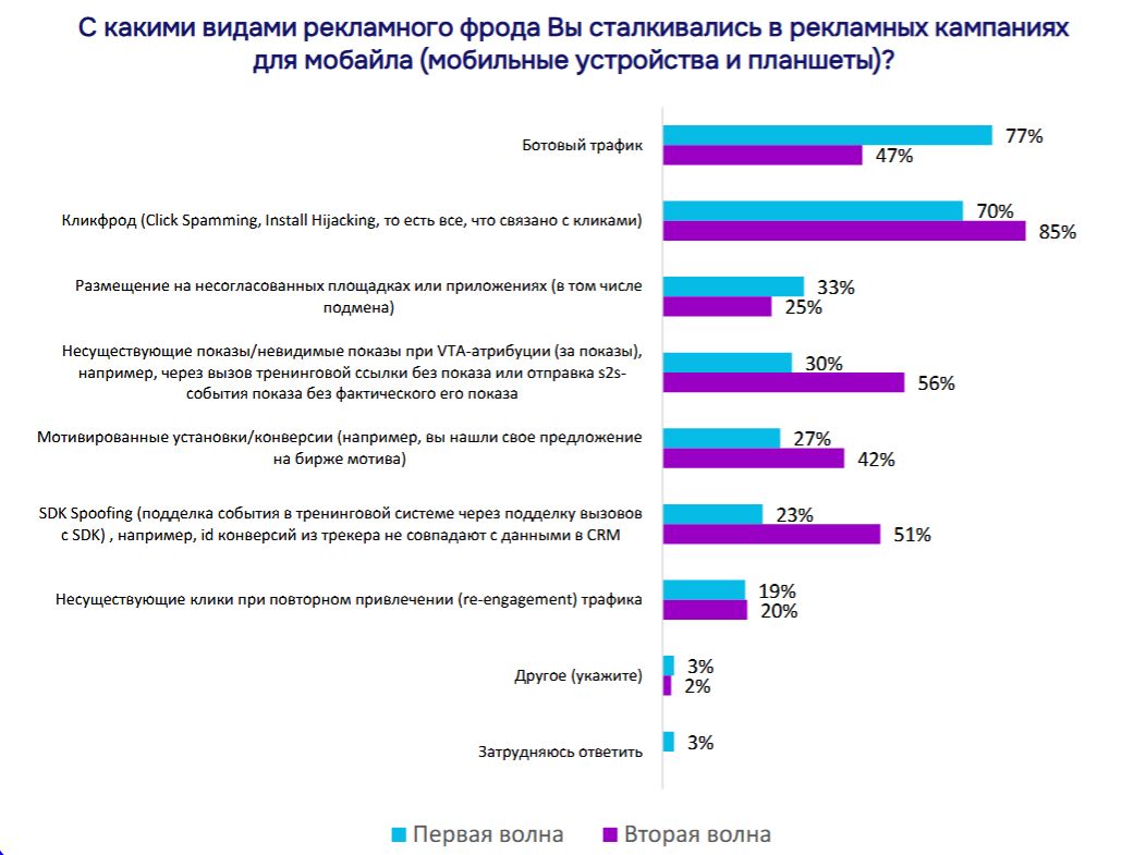 Исследование зафиксировало резкий рост технически сложных видов мошеннического трафика в мобильной рекламе. За год доля агентств, столкнувшихся с подделкой событий в трекинговых системах (SDK Spoofing), выросла более чем вдвое — с 23% до 51%. Аналогичная ситуация произошла с невидимыми показами при VTA-атрибуции (за показы, например, через вызов тренинговой ссылки без показа). С таким видом фрода столкнулись в 2025 году 56% респондентов против 30% годом ранее. Главная проблема рекламного рынка — кликфрод (Click Spamming, Install Hijacking — все, что связано с кликами) — также увличила присутствие на 15 п.п. до 85% в 2025 году. В то же время распространенность более примитивных методов, таких как ботовый трафик, заметно снизилась (с 77% до 47%).