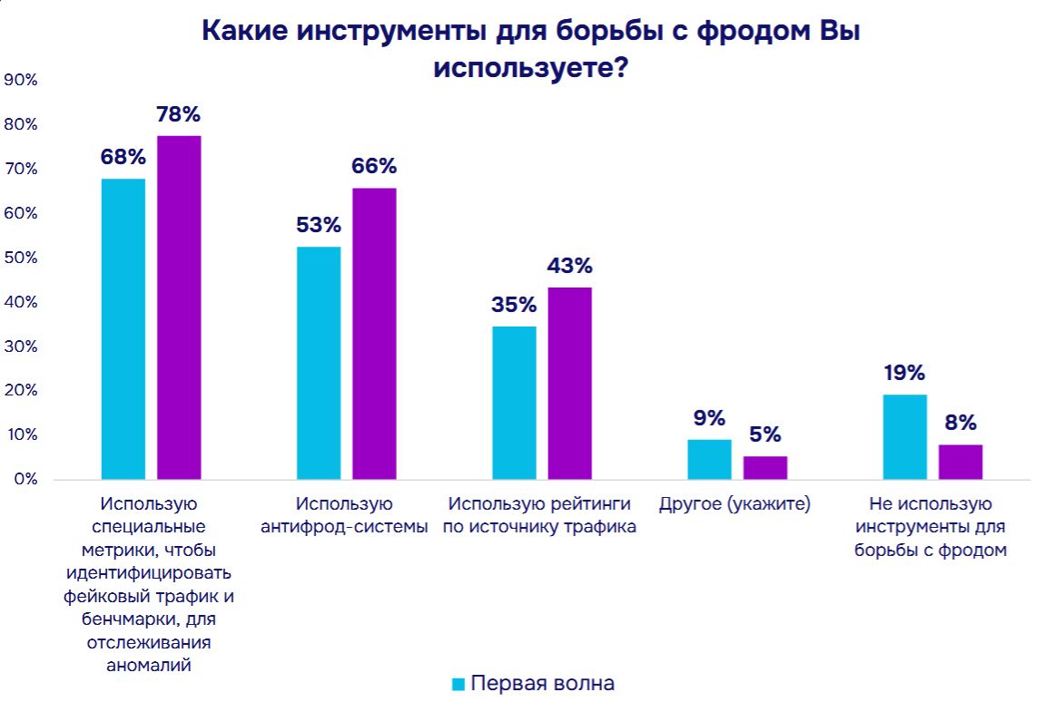 В ответ на действия мошенников, агентства стали чаще использовать инструменты защиты. За год доля рекламных агентств, применяющих специальные метрики идентификации фродового трафика и бенчмарки для отслеживания аномалий, выросла с 68% до 78%, а общее использование антифрод-систем стало практикой для 66% компаний против 53% годом ранее. Более чем в два раза сократилось число тех, кто не использует никаких инструментов борьбы с мошенническим трафиком (с 19% до 8%).
