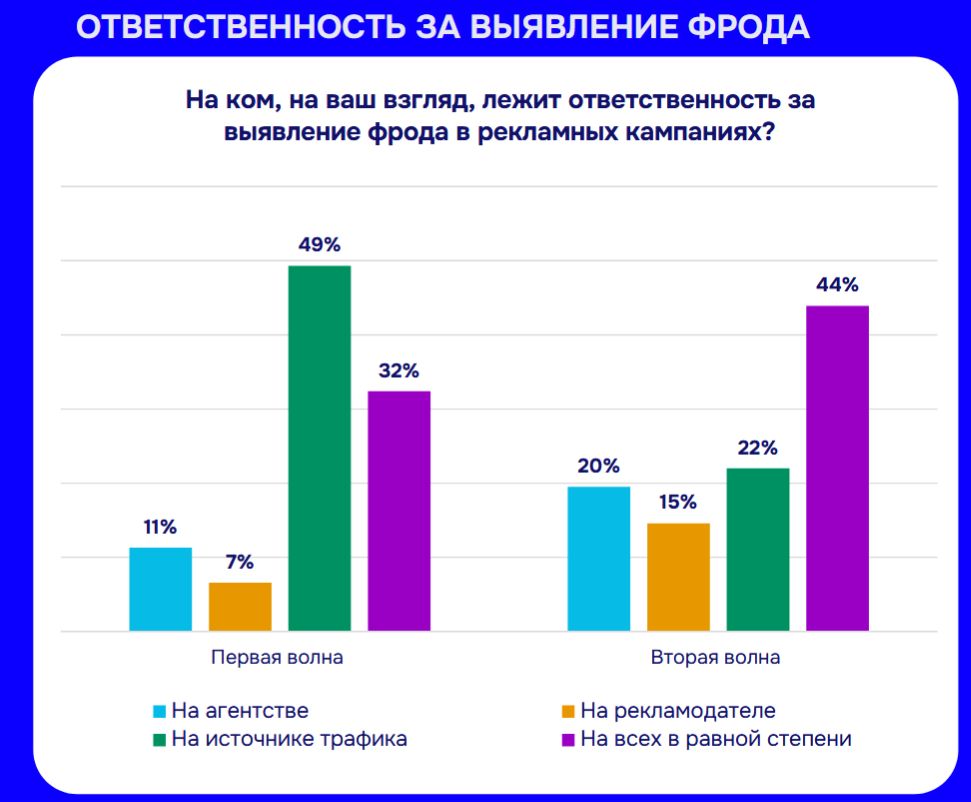 В 2024 году почти половина респондентов (49%) возлагала ответственность за выявление фрода на источники трафика. В 2025-м эта доля сократилась более чем вдвое — до 22%. Теперь почти половина опрошенных считают, что ответственность лежит на всех участниках рынка в равной степени (доля таких ответов выросла с 32% до 44%). Одновременно агентства стали чаще брать ответственность на себя: доля считающих, что фрод должны выявлять сами агентства, выросла с 11% до 20%.
