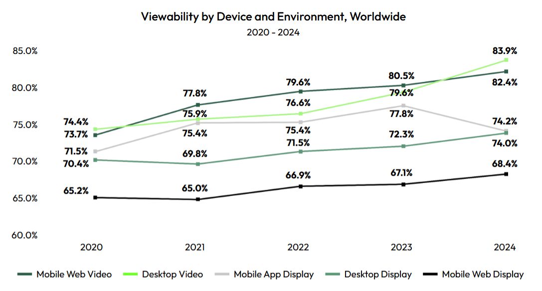 Общий глобальный показатель видимости рекламы немного вырос с 76,1% в конце 2023 года до 76,5% в конце 2024-го.