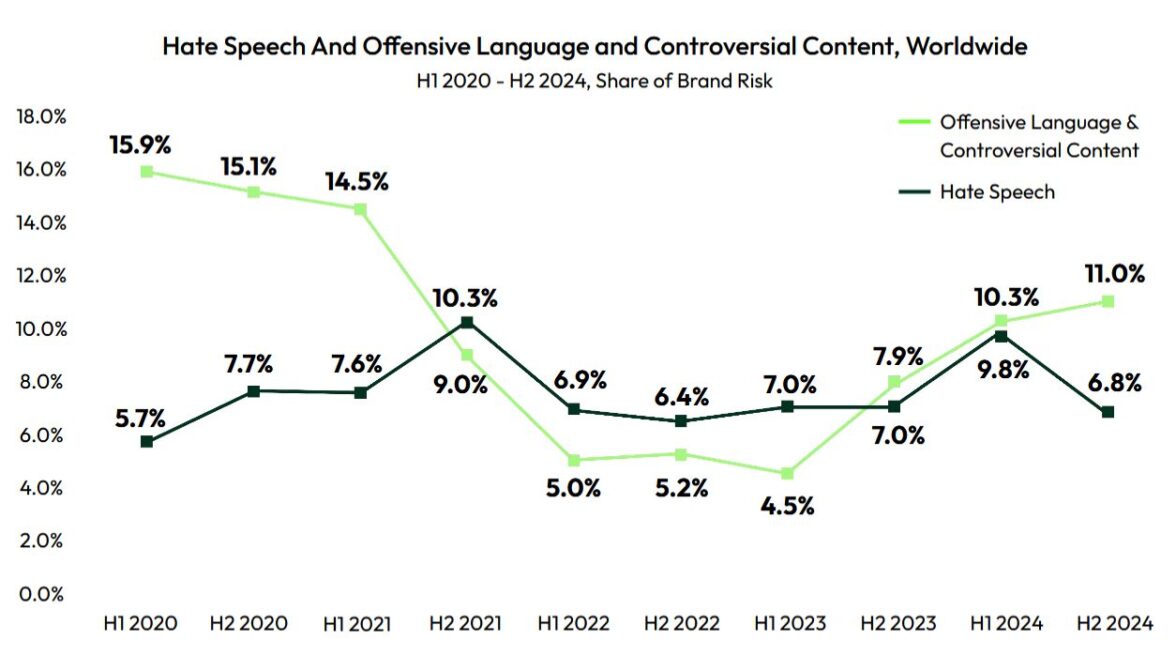 Доля оскорбительного и спорного контента в общем объеме контента, представляющего риск для брендов, увеличилась с 10,3% в 2023 году до 11% в 2024-м. Доля контента, разжигающего ненависть, в первом полугодии 2024 года составила 9,8% против 7% в 2023 году.
