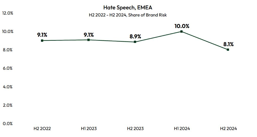 Среди всех регионов мира ненавистнический контент представляет наибольшую угрозу для европейских брендов, уверены в IAS. В этом регионе его доля в общем нежелательном контенте составляет 9,3%, а лидерами являются Ирландия (15,8%) и Великобритания (15,7%). Однако после мер, принятых Европарламентом против ненависти и травли в интернете во второй половине 2024 года, доля такого контента стала падать. В США на фоне поляризации общества, связанной с выборами президента, в 2024 году доля оскорбительного контента увеличилась до 5,5% с 4,3% годом ранее.