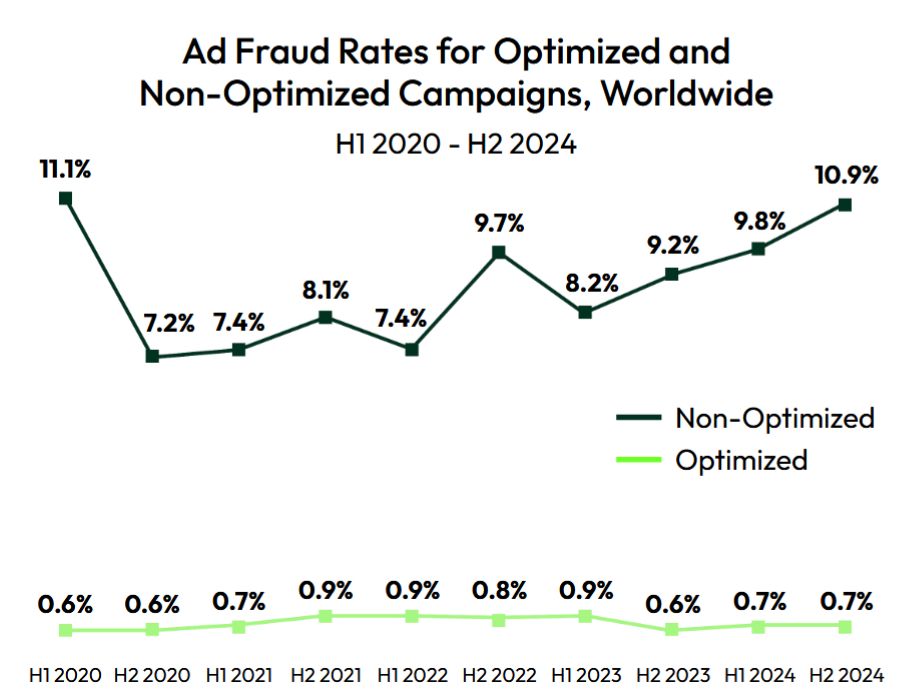 В неоптимизированной рекламе после пика в начале 2020 года (11,1%), связанного с популярностью онлайн-продвижения во время пандемии, уровень мирового фрода упал до 7,4% в 2021 году, а затем вновь стал расти, достигнув нового пика (10,9%) в конце 2024 года.