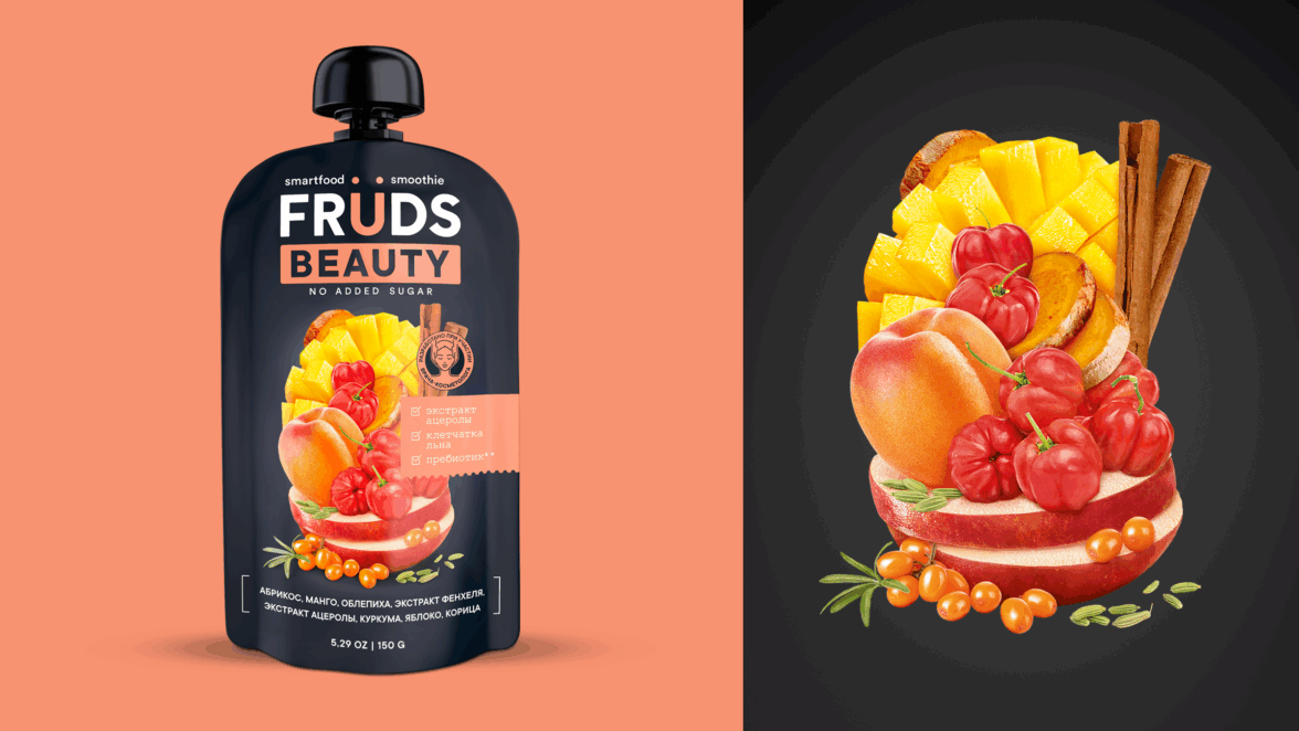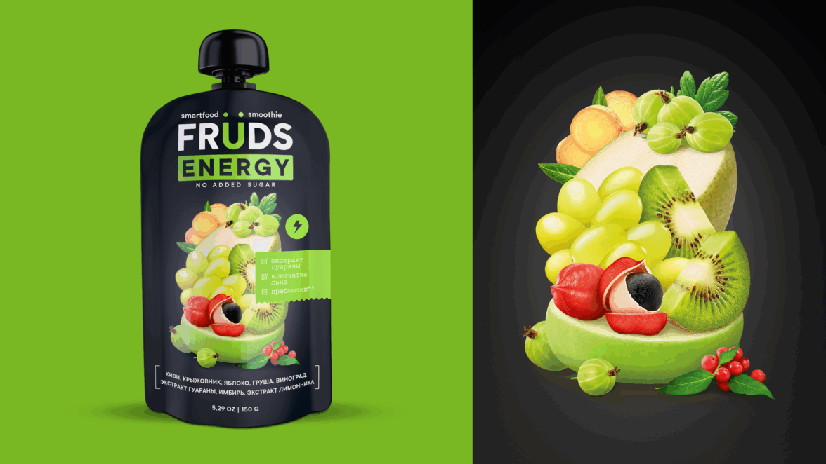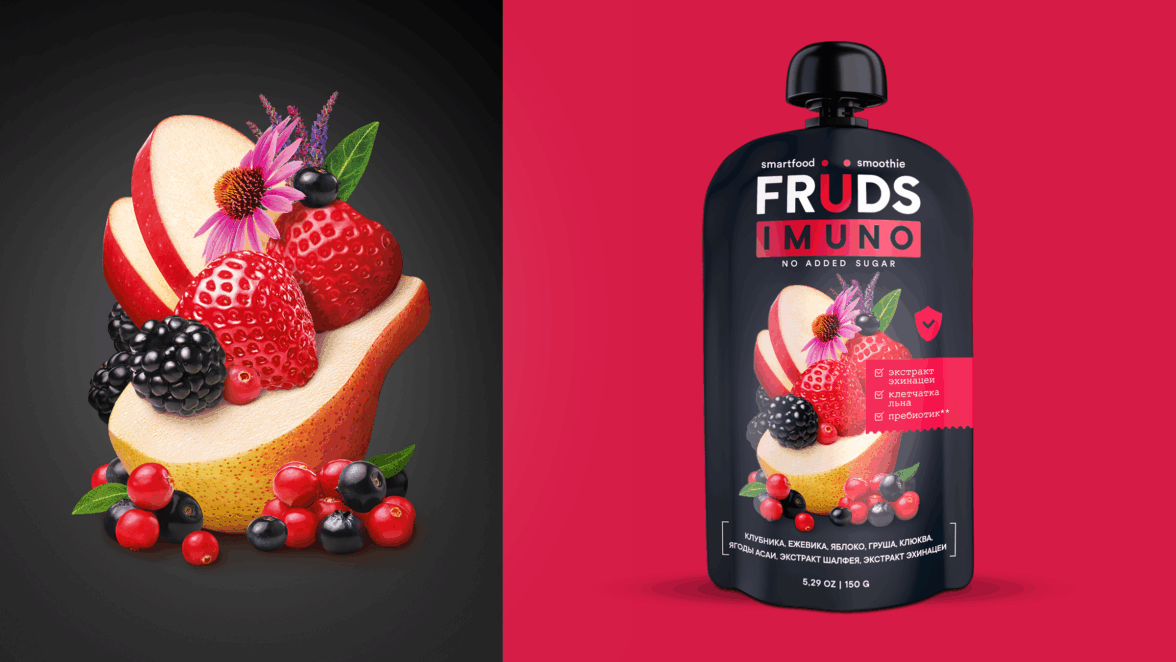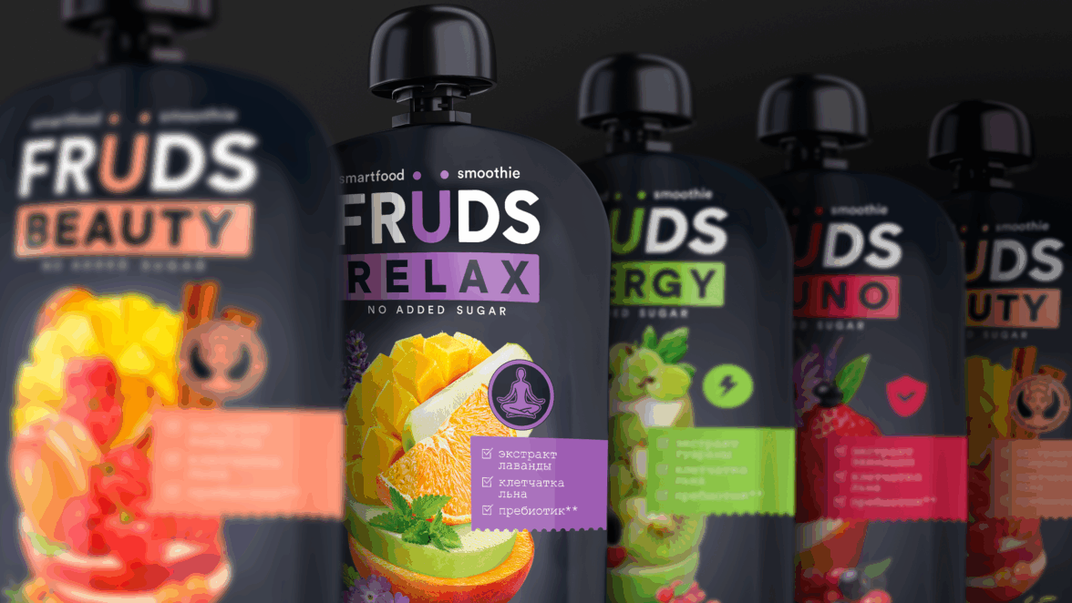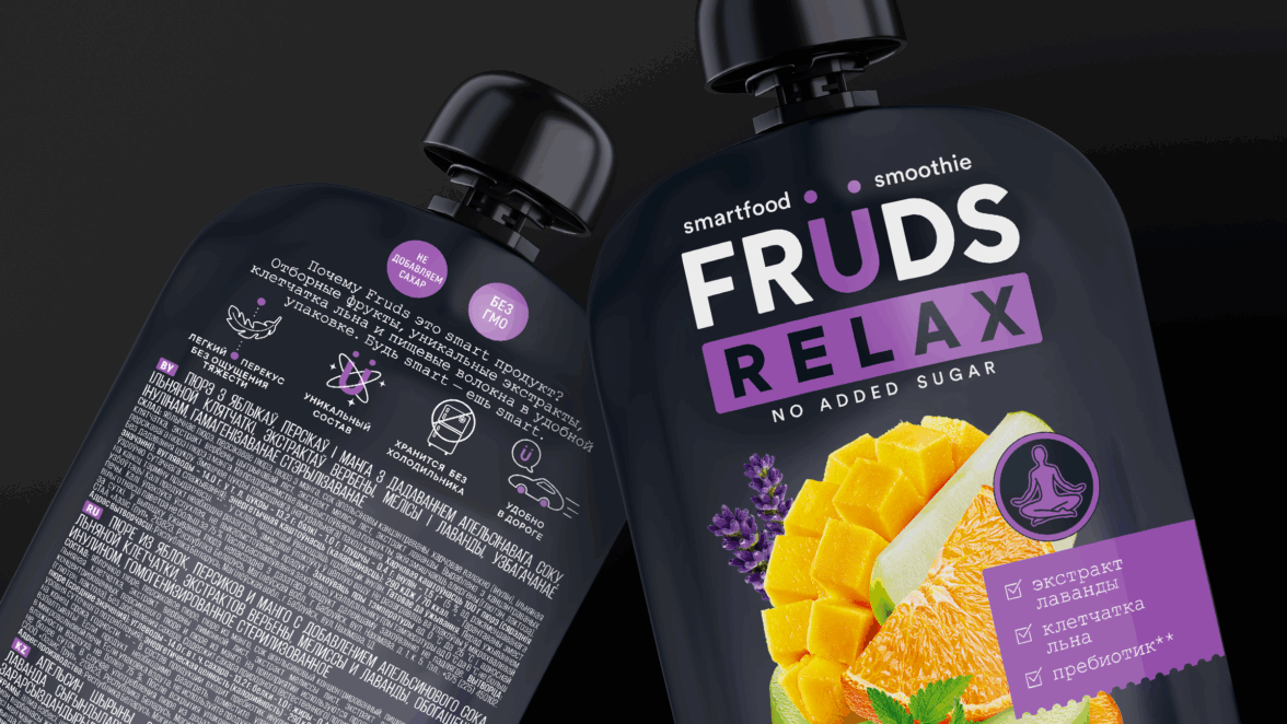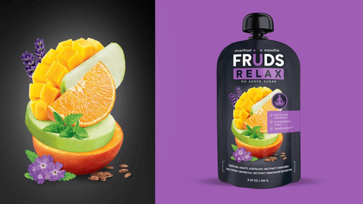 Перед брендом FRUDS стояла задача органично ввести в существующую линейку функциональных смузи новый продукт — RELAX, сохранив единство дизайн-системы, но при этом обеспечив его быстрое распознавание на полке. Важно было донести уникальное позиционирование новинки, сделав акцент на натуральности состава и функциональной пользе для релаксации, а также визуально выделить ключевые ингредиенты: клетчатку льна, экстракт лаванды и пребиотик.