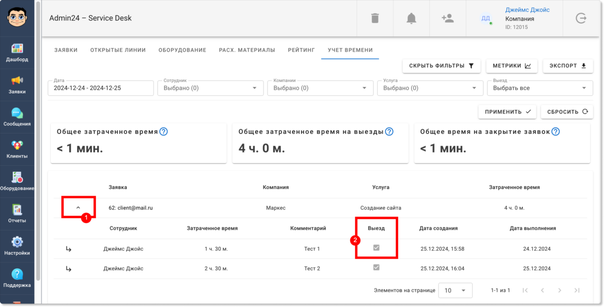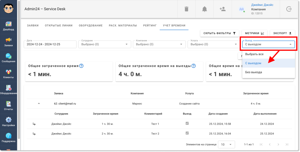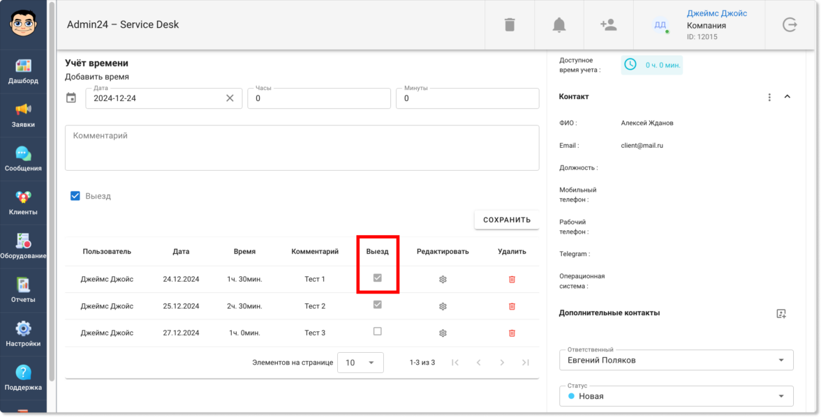 Теперь внутри заявок в Admin24 при добавлении времени можно помечать, что оно задано для выездных работ.