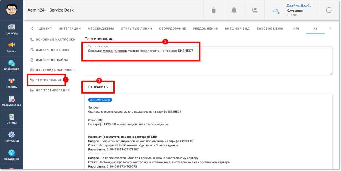 Когда настройка будет завершена, вы сможете протестировать, как AI-агент будет отвечать на вопросы, импортированные из файла. Для этого перейдите во вкладку «Тестирование» и отправьте свой вопрос.