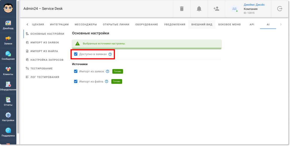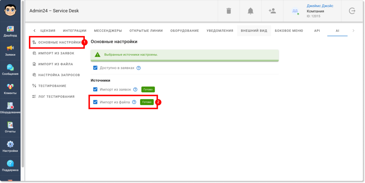 Чтобы после индексации ИИ для ответов на запросы использовал информацию из импортированного файла, необходимо активировать соответствующий источник данных в новой вкладке «Основные настройки»: