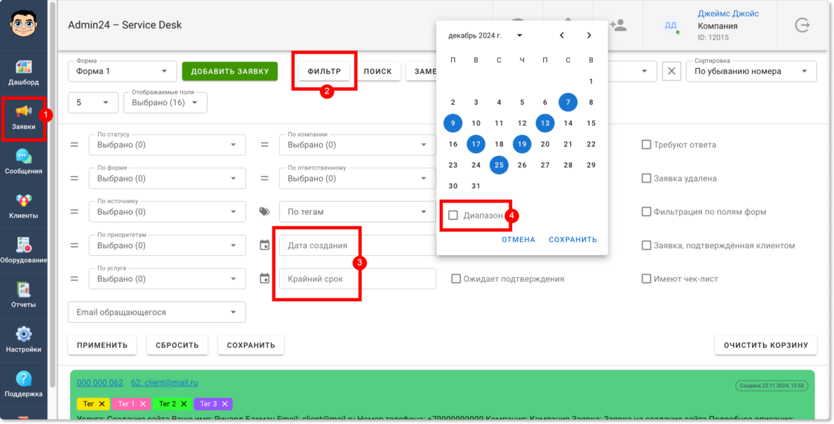 Так, чтобы выбрать несколько дат в разделе «Заявки», нажмите на кнопку «Фильтр», далее — на поле «Дата создания» или «Крайний срок» и уберите флажок в чекбоксе «Диапазон».