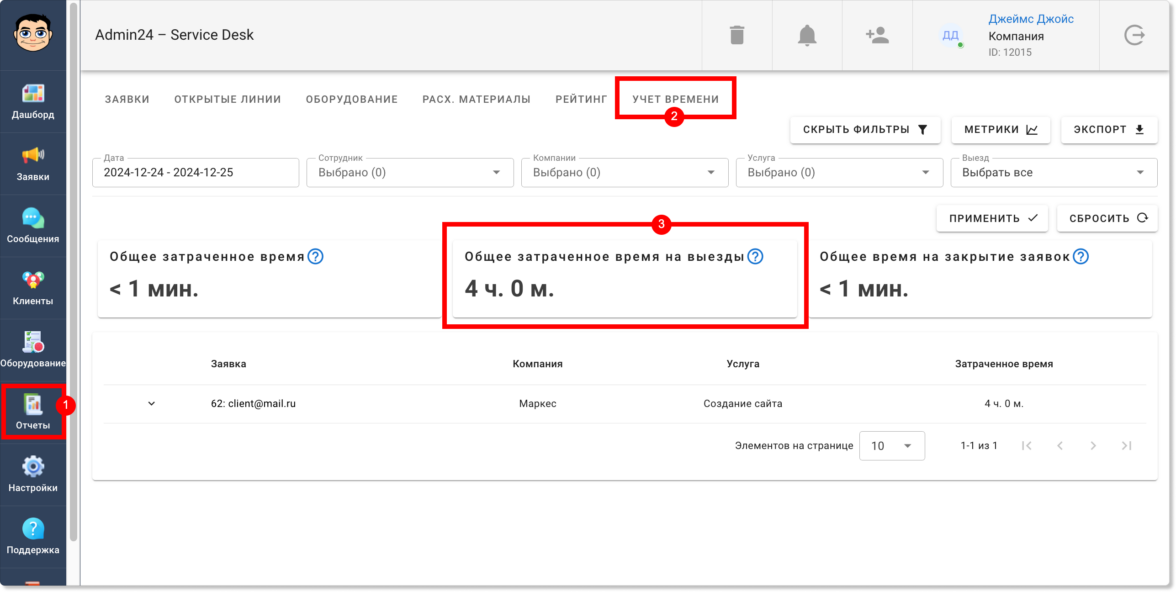 Информация по работам на выезде будет отображаться также и в разделе «Отчеты» → «Учет времени».