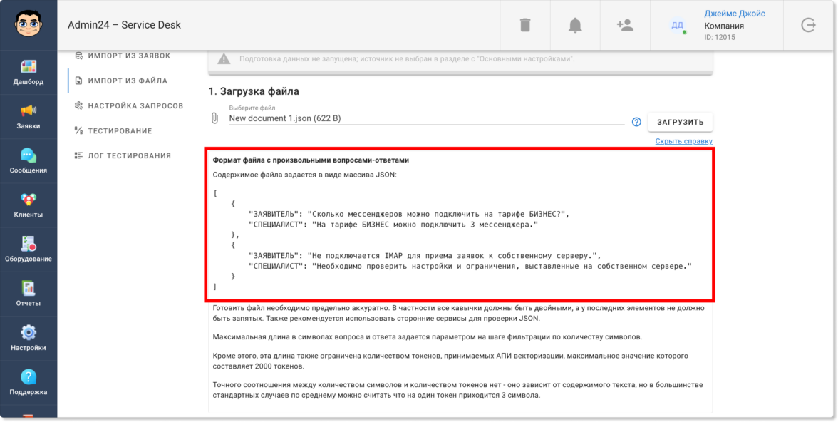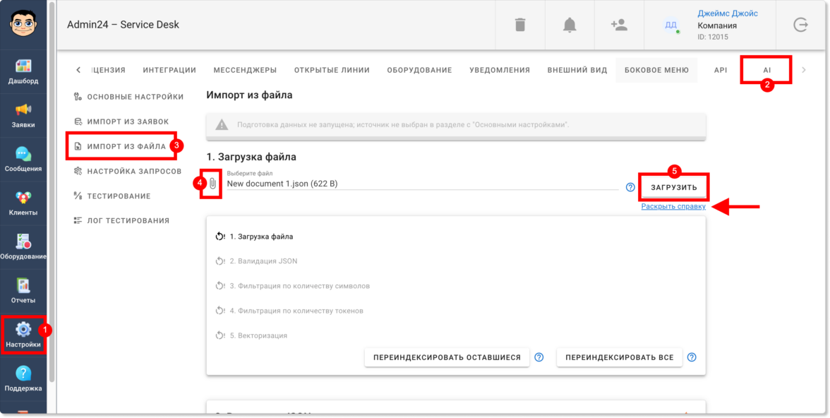 Чтобы добавить свои вопросы и ответы, в настройках сервис-деска перейдите во вкладку «AI» → «Импорт файлов». Далее — нажмите на значок скрепки, выберите файл в формате .json и нажмите кнопку «Загрузить».