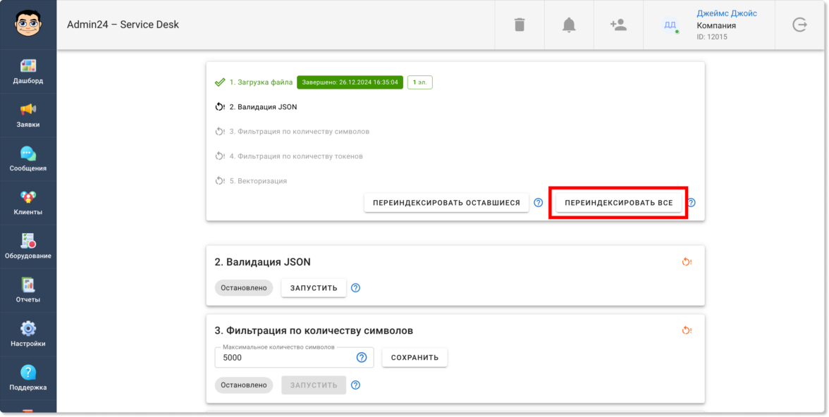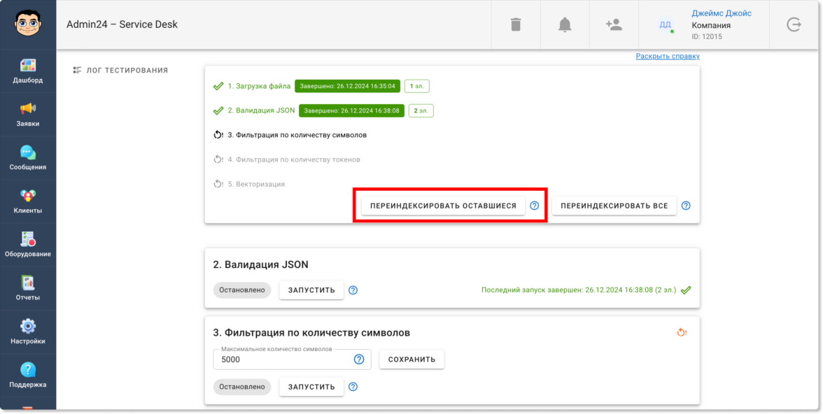 Если необходимо повторно запустить шаги после изменения настроек фильтрации, можно также воспользоваться кнопкой «Проиндексировать оставшиеся» — в этом случае система самостоятельно по очереди перезапустит каждый шаг.
