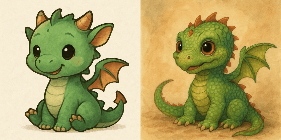 Повторы. Иногда нейросети выдают по разным описаниям очень похожие изображения. Например, к Новому году я генерировал дракона. Составил несколько промптов с общими словами «маленький» и «милый» — такое было условие. И нейронка хваталась за эти слова и каждый раз выдавала плюс-минус одного и того же персонажа, несмотря на различия в запросах.Позже я видел его и в других рассылках, и на рекламных щитах, и ещё много где. Так что проблема была не только у меня: все дизайнеры, которым потребовался милый дракончик, получили таких «братьев».