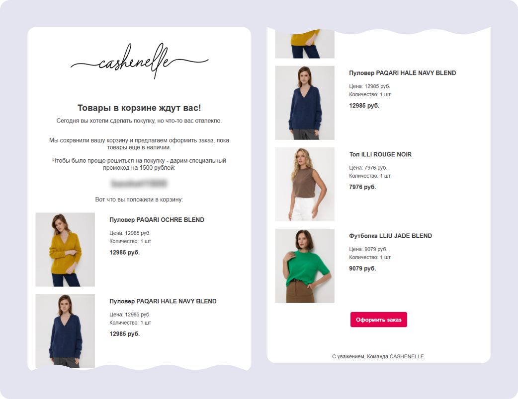 Триггерные цепочки писем помогают вести клиента к покупке, пока его интерес не угас. Например, бренд Cashenelle с помощью писем напоминает клиентам об оставленных в корзине товарах