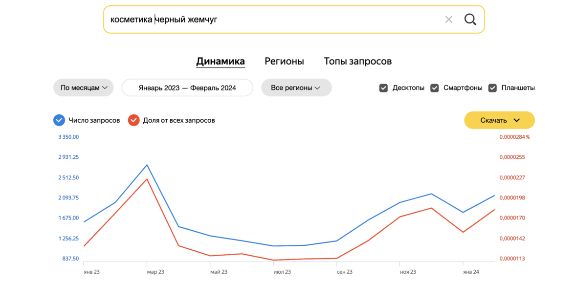 На изображении видно, что пользователи стабильно интересуются брендом косметики «Черный жемчуг» в поисковой строке.