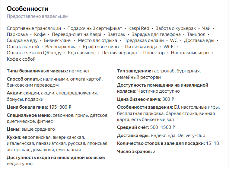 Его можно развернуть и увидеть все особенности заведения, которые указал владелец.