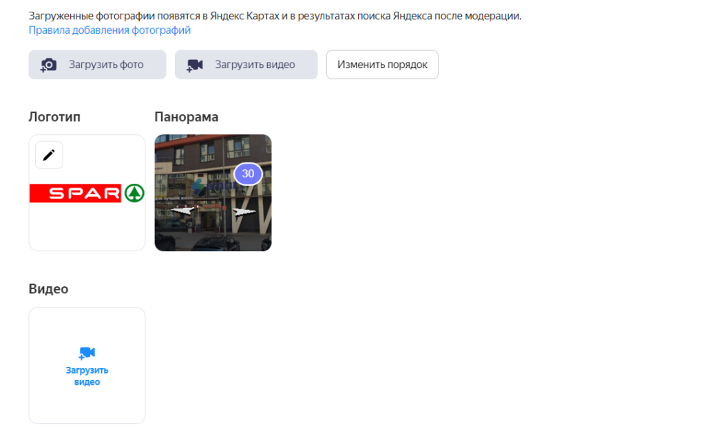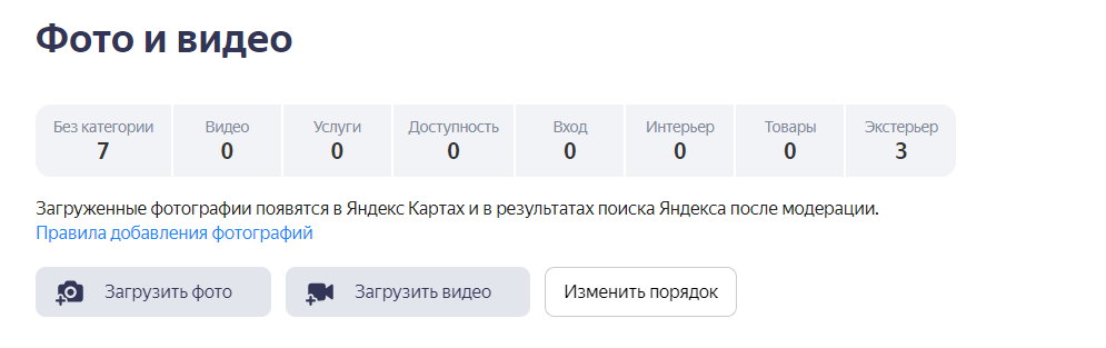 Фотографии можно пометить тегами (услуги, товары, вход, интерьер, экстерьер и др.). Порядок отображения фото можно менять.