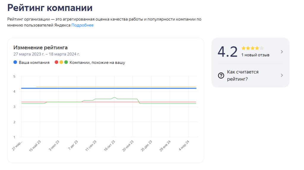 Здесь отображается подробная информация о рейтинге компании, который формируется на основе отзывов пользователей Яндекса. Можно отслеживать динамику изменения за год и сравнивать свой рейтинг с рейтингом конкурентов. Данные наглядно представлены на графике.