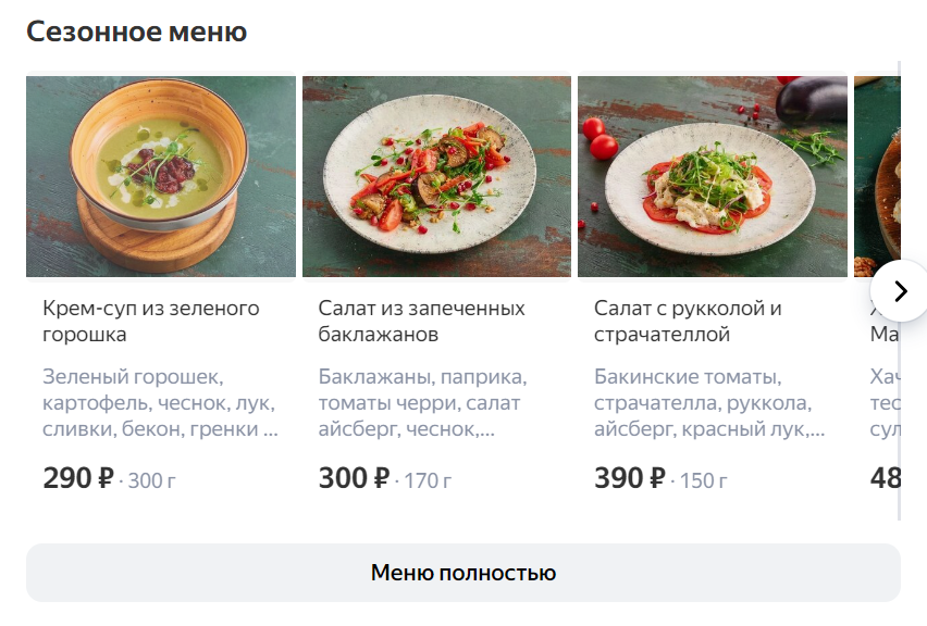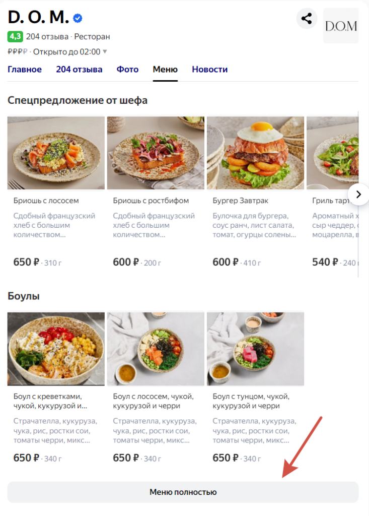 Меню с фото и ценами отображается в отдельной вкладке. В нее попадает все, что вы загрузили в соответствующий раздел профиля. Для кафе и ресторанов, подключенных к Яндекс.Еде, отображается соответствующая кнопка. Есть возможность просмотреть меню полностью.