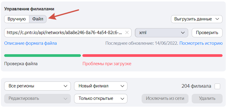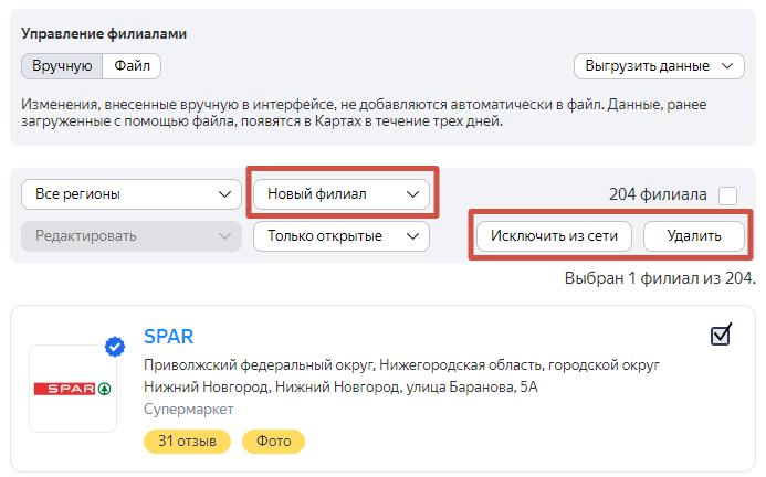 Все филиалы должны быть добавлены в Яндекс Бизнес.