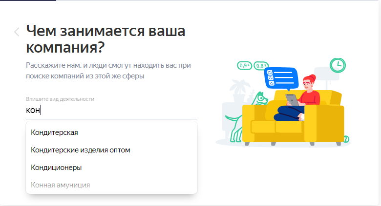 На следующем шаге нужно выбрать вид деятельности. Начните вводить ключевое слово, и Яндекс подскажет варианты категорий: