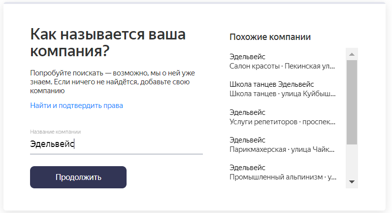 Если вашей компании нет среди них, нажимайте «Продолжить». Если есть — подтвердите права на уже созданный профиль.