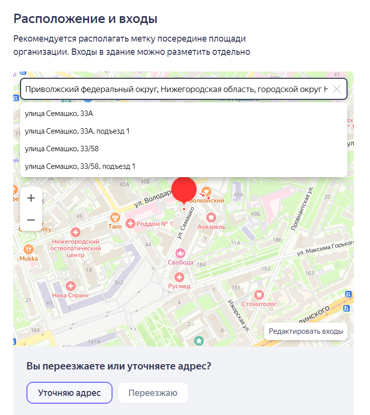 Если адрес компании нужно уточнить или поменять, сделайте это на карте: