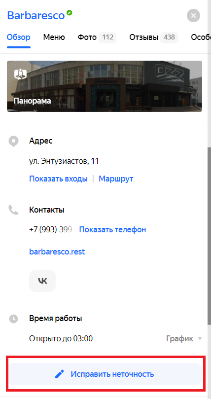 В этом же разделе вы увидите панораму, которая подгружается с Яндекс.Карт. Можно заказать интерьерную панораму у партнеров Яндекса, чтобы выделиться среди конкурентов.