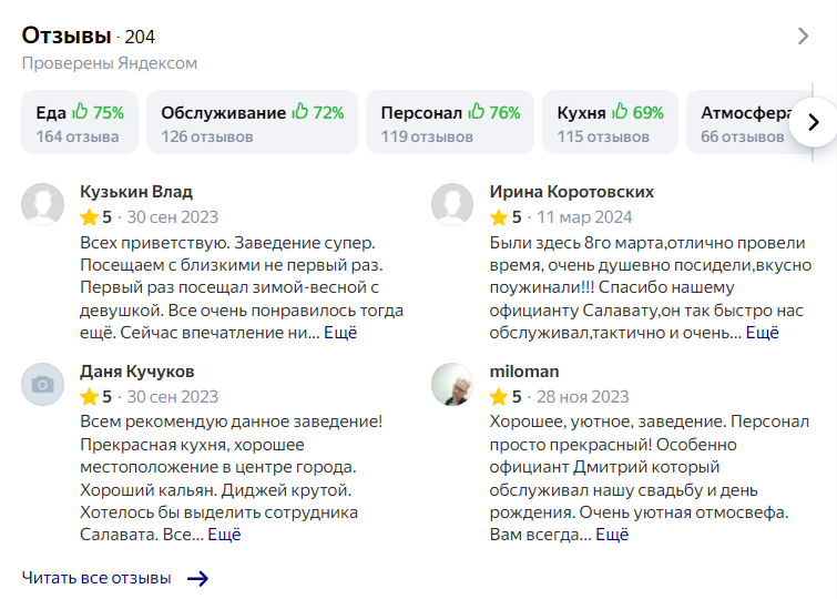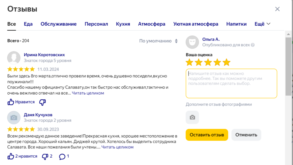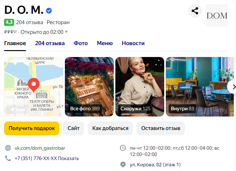 Давайте посмотрим, как будет выглядеть ваш профиль на Картах и в поиске Яндекса справа от выдачи, если вы ответственно подойдете к заполнению всех разделов профиля — на примере ресторана.