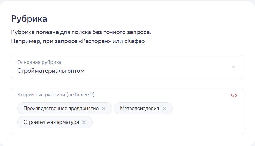 Выберите одну основную и две дополнительные рубрики, которые наиболее точно характеризуют ваш бизнес.
