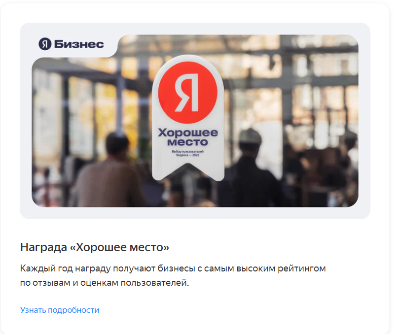 В этом разделе представлены промоматериалы от Яндекса. Прежде всего по ссылке можно проверить, есть ли у вашей компании награда «Хорошее место», и узнать информацию, как ее получить.