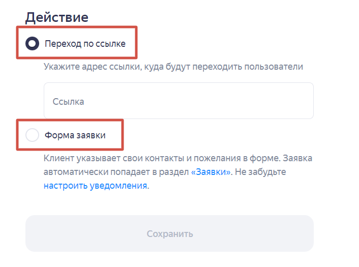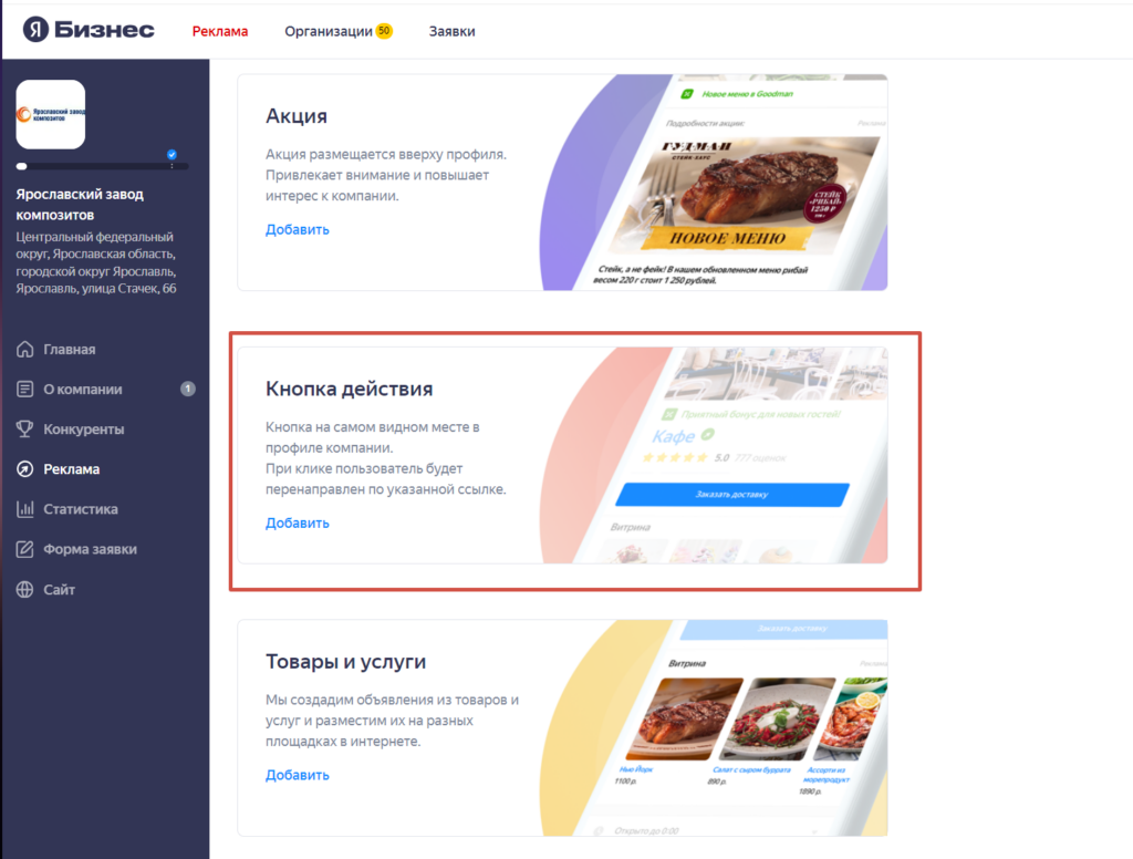 Можно подключить кнопку действия с опцией онлайн-записи или заказа доставки через сервисы партнеров Яндекса. Это доступно только для определенных видов деятельности: