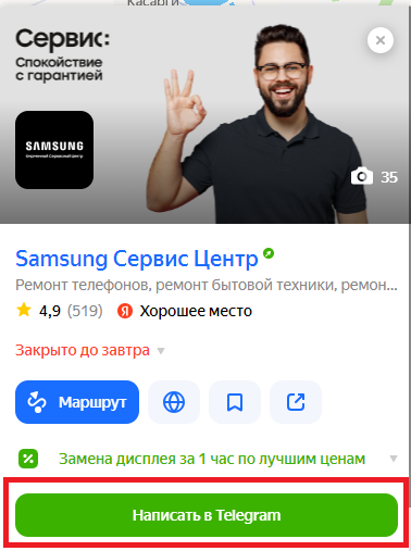 Вот как это будет выглядеть в карточке сервисного центра на Яндекс.Картах: