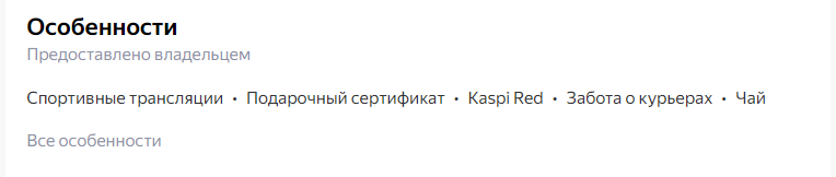 Сразу после отзывов расположен блок, в который подтягивается информация из раздела «Особенности» Яндекс Бизнеса.