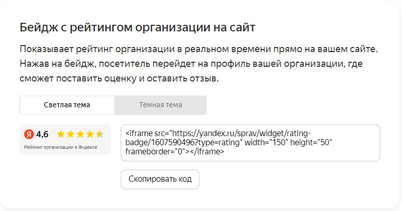 Если вы гордитесь своим рейтингом отзывов, можете скопировать код и установить на сайт бейдж. Рейтинг будет автоматически подтягиваться с Яндекс.Карт, ссылка также приведет пользователя на профиль организации.